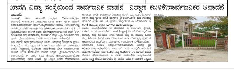 ದಾವಣಗೆರೆ:ದಾವಣಗೆರೆಯ ಮಹಾನಗರಪಾಲಿಕೆಯ 33(ಮೂವತ್ಮೂರ)ನೇವಾರ್ಡಿನಲ್ಲಿರುವ ಸಾರ್ವಜನಿಕ ಪಾರ್ಕಿನ ಪಕ್ಕದಲ್ಲಿ ಅಂದಾಜು 20*80ಅಡಿ ಜಾಗವನ್ನು ಪಾರ್ಕಿಗೆ ಬರುವ ನಾಗರೀಕರ ವಾಹನ ನಿಲ್ದಾಣಕ್ಕೆ ಮೀಸಲಿದ್ದ ಖಾಲಿ ಜಾಗವನ್ನು ಇಲ್ಲಿಯ ಪ್ರಭಾವಿ ಒಡೆತನಕ್ಕೆ ಸೇರಿದ ಖಾಸಗೀ ಶಿಕ್ಷಣ ಸಂಸ್ಥೆಯು ಅಕ್ರಮವಾಗಿ ಗೇಟ್ ಅಳವಡಿಸಿ ಸಾರ್ವಜನಿಕ ಜಾಗವನ್ನು ಅಕ್ರಮಿಸಿಕೊಂಡು ಸಾರ್ವಜನಿಕರಿಗೆ ಅನಾನುಕೂಲಮಾಡಿದ್ದನ್ನು ಸ್ಥಳಿಯರು ಸಹಾಯವಾಣಿ ಪತ್ರಿಕೆಯ ಗಮನಕ್ಕೆ ತಂದಾಗ ಪತ್ರಿಕೆಯಲ್ಲಿ ಈ ಸುದ್ದಿಯನ್ನು ಪ್ರಕಟಿಸಿತು.