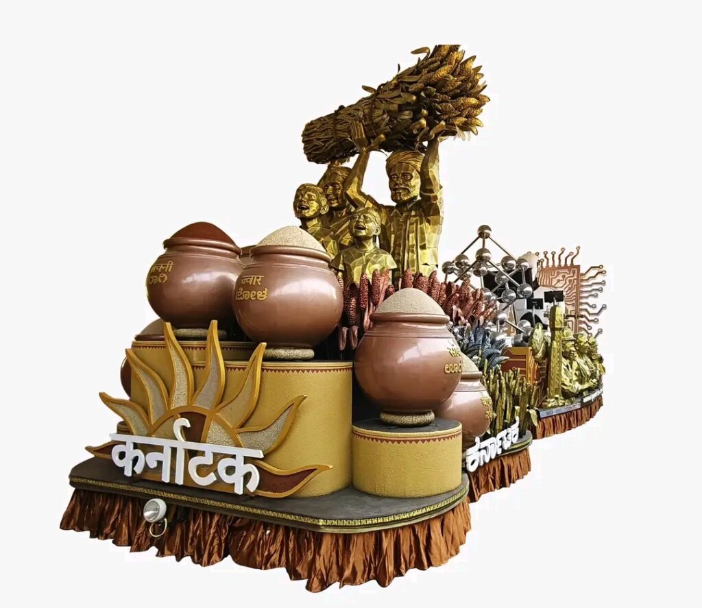 ಸ್ತಬ್ಧಚಿತ್ರದಲ್ಲಿ ಏನಿರಲಿದೆ: ಸ್ತಬ್ಧಚಿತ್ರದ ಮುಂಭಾಗದಲ್ಲಿ ಉದಯಿಸುತ್ತಿರುವ ಸೂರ್ಯ ನಿರಂತರ ಪ್ರಗತಿ ಮತ್ತು ಚಲನಶೀಲತೆಯ ಸಂಕೇತವಾಗಿ ಹೊಳೆಯುತ್ತಿದೆ. ದೊಡ್ಡ ಮಡಿಕೆಗಳಲ್ಲಿ ಪ್ರದರ್ಶಿಸಲಾದ ವಿವಿಧ ಸಿರಿಧಾನ್ಯಗಳು ಕೃಷಿ ಸಮೃದ್ಧಿಯನ್ನು ತೋರಿಸುತ್ತವೆ. ಬೆಳೆದ ಫಸಲನ್ನು ಎತ್ತಿಹಿಡಿದಿರುವ ರೈತ, ಆತನ ಪತ್ನಿ ಹಾಗೂ ಉಲ್ಲಾಸದಿಂದ ಕಾಣಿಸುತ್ತಿರುವ ಮಕ್ಕಳು ಗ್ರಾಮೀಣ ಶಕ್ತಿಯ ಜೀವಂತ ಚಿತ್ರಣವಾಗಿದ್ದಾರೆ.