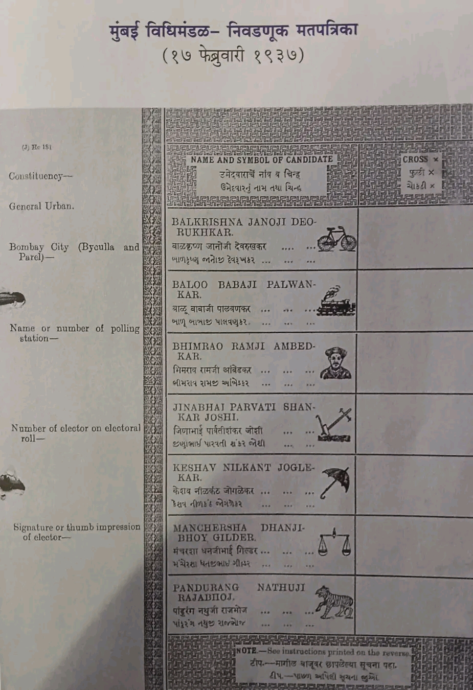 1937ರಲ್ಲಿ ಮುಂಬೈ ವಿಧಾನಸಭೆಗೆ ನಡೆದ ಚುನಾವಣೆಯಲ್ಲಿ ಸ್ವತಂತ್ರ ಕಾರ್ಮಿಕ ಪಕ್ಷದ (Independent Labour Party) ಅಭ್ಯರ್ಥಿಯಾಗಿ, ಡಾ. ಬಾಬಾಸಾಹೇಬ ಅಂಬೇಡ್ಕರ್ ಅವರು ಮಧ್ಯ ಮುಂಬೈ ಸಾಮಾನ್ಯ ಕ್ಷೇತ್ರದಿಂದ (ಬೈಖಳಾ ಮತ್ತು ಪರಳ) ಸ್ಪರ್ಧಿಸಿದ್ದರು. ಅವರ ಚುನಾವಣೆಯ ಮತಪತ್ರವಿದು. ಅವರ ಚುನಾವಣಾ ಚಿಹ್ನೆ ‘ಮನುಷ್ಯ’ ಆಗಿತ್ತು.